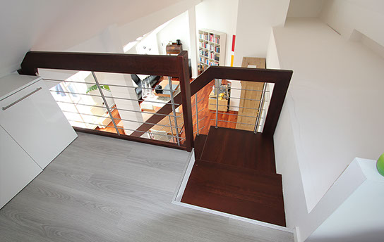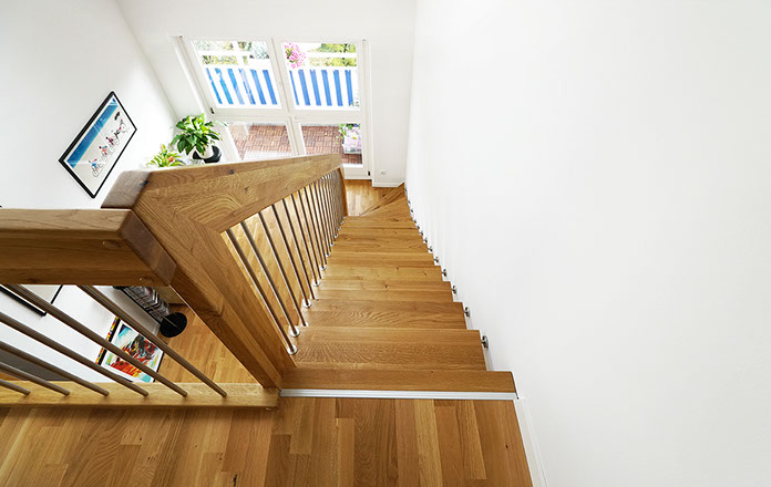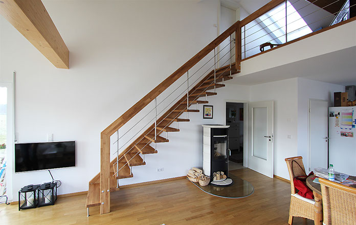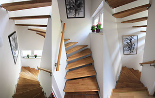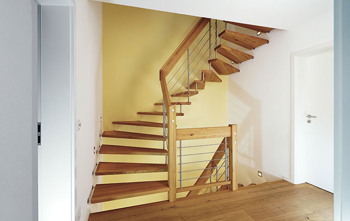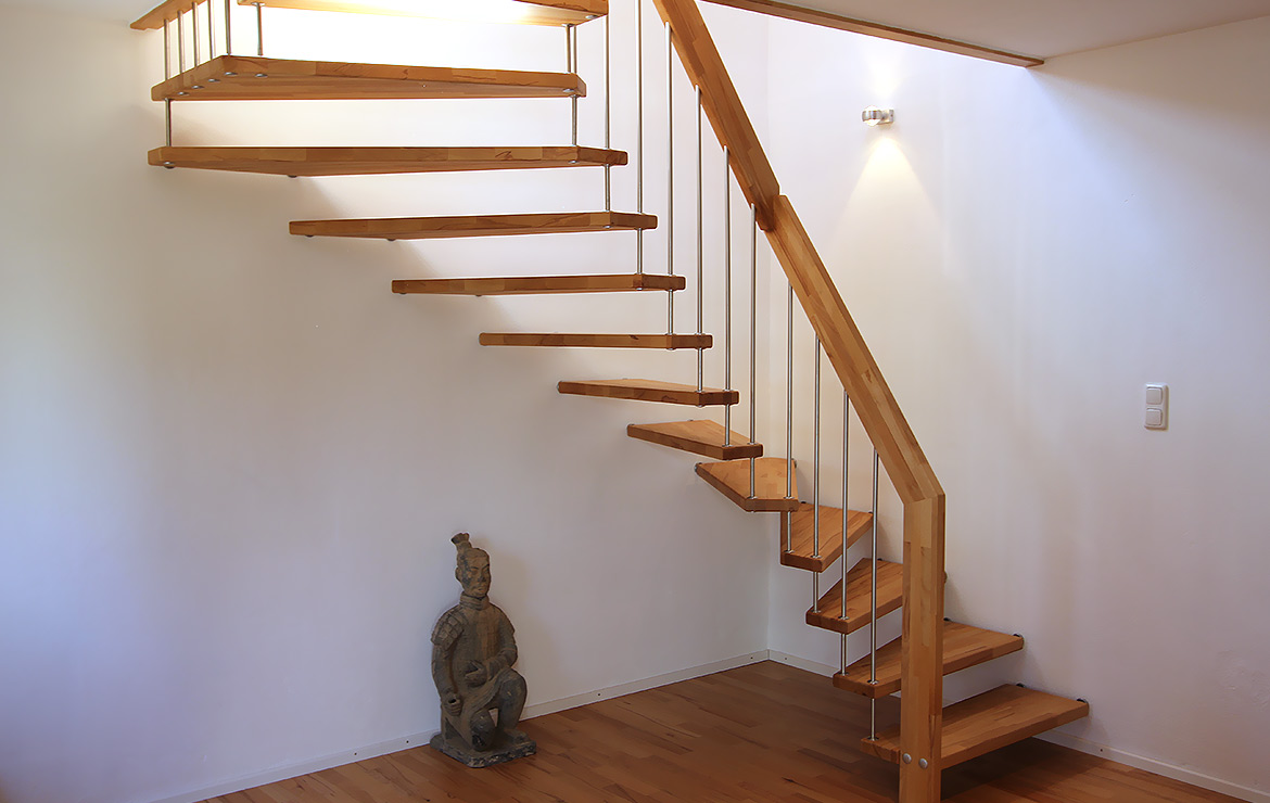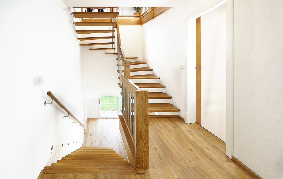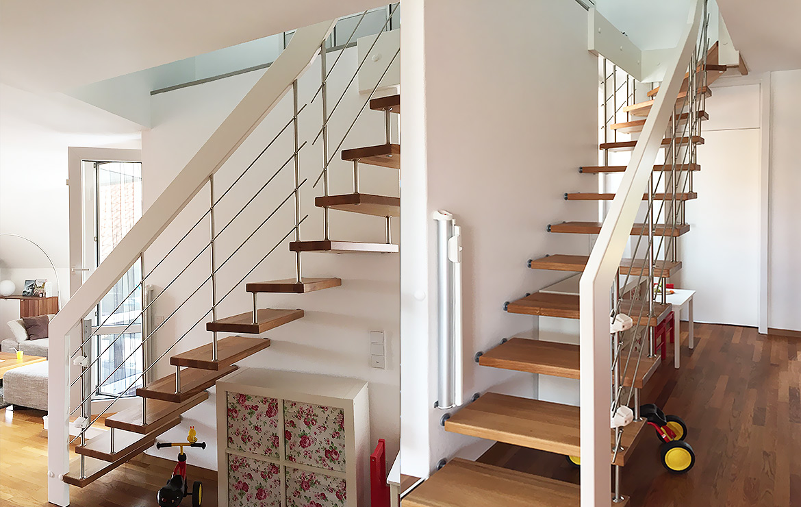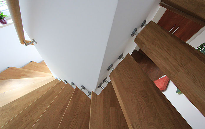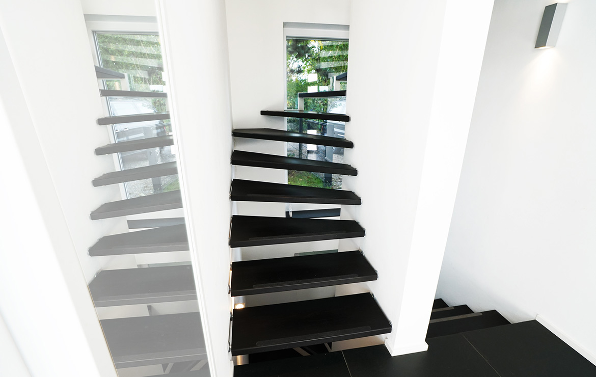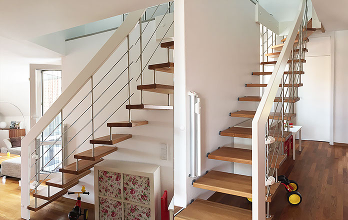 Das Geländer ist Teil der tragenden Konstruktion. Mit der Beschränkung auf das Wesentliche, nämlich Stufen und Geländer, wurde der Treppenbau revolutioniert. Quasi unsichtbar halten die in schalldämmenden Kautschuklagern gehaltenen Stahlbolzen auf der Wandseite die Treppe und das Geländer (Handlauf und Sprossen) die einzelnen Treppenstufen auf der offenen Seite. Eine optimale Verbindung aus Technik und Design, mit vielen Vorteilen.