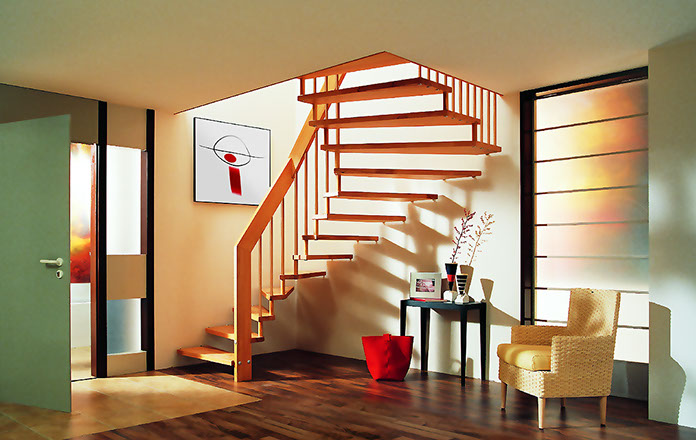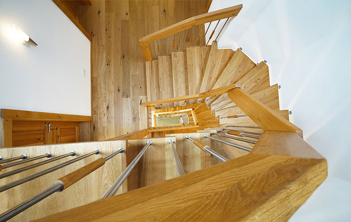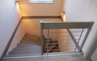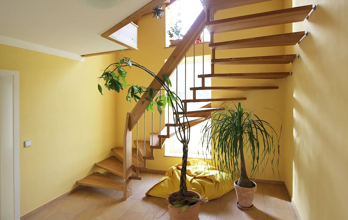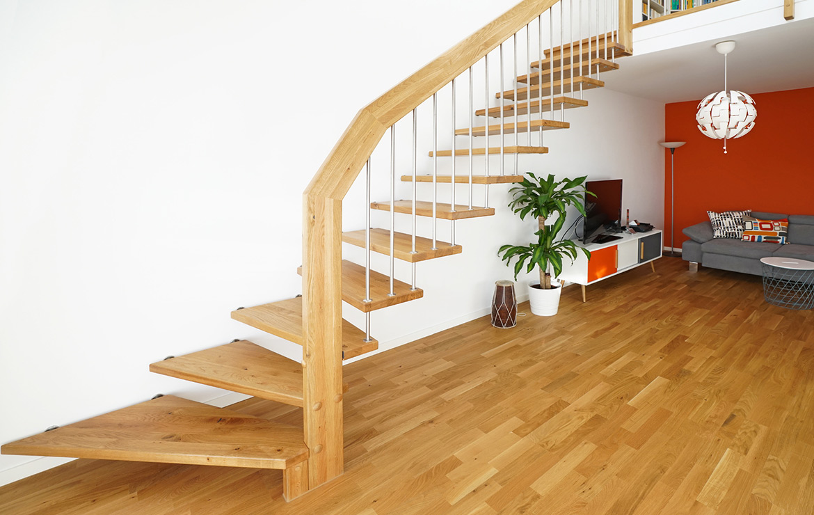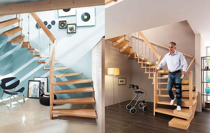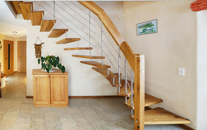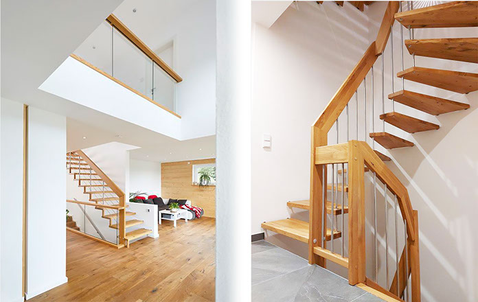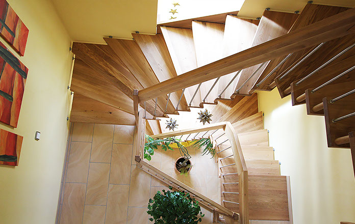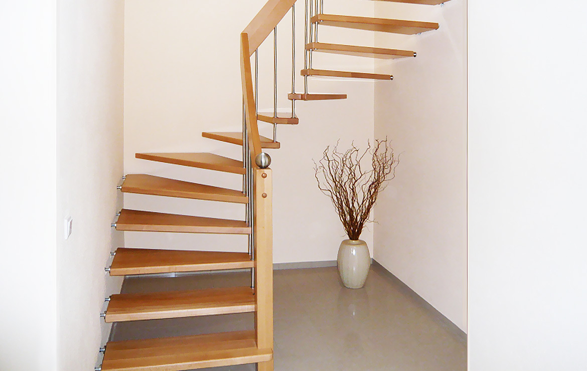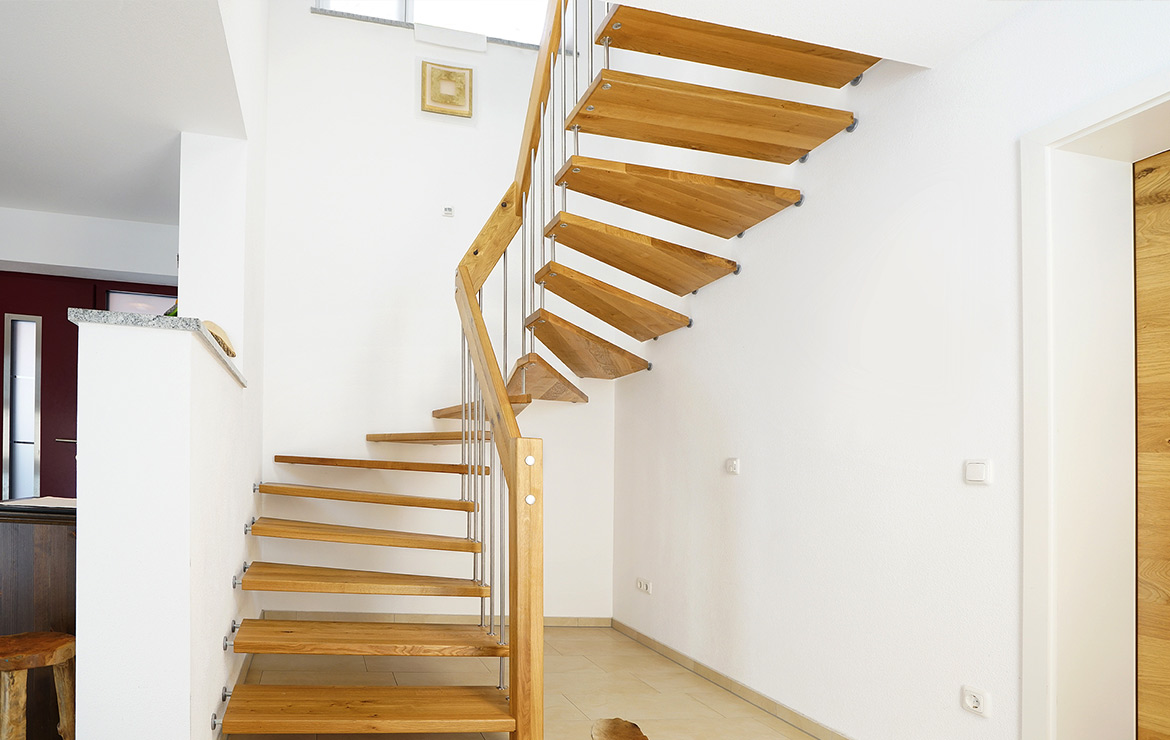 Das Geländer ist Teil der tragenden Konstruktion. Mit der Beschränkung auf das Wesentliche, nämlich Stufen und Geländer, wurde der Treppenbau revolutioniert. Quasi unsichtbar halten die in schalldämmenden Kautschuklagern gehaltenen Stahlbolzen auf der Wandseite die Treppe und das Geländer (Handlauf und Sprossen) die einzelnen Treppenstufen auf der offenen Seite. Eine optimale Verbindung aus Technik und Design, mit vielen Vorteilen.