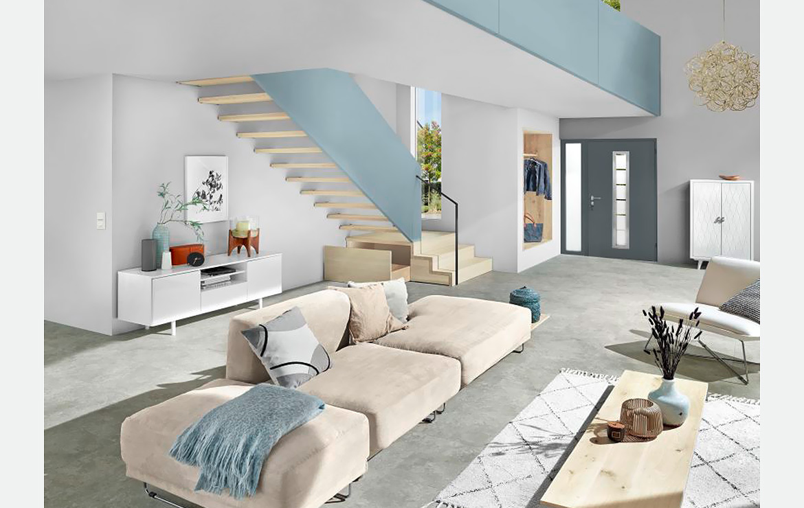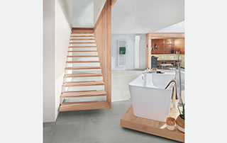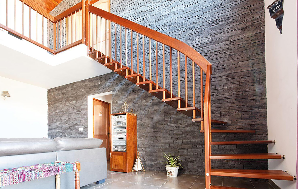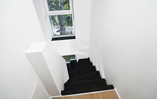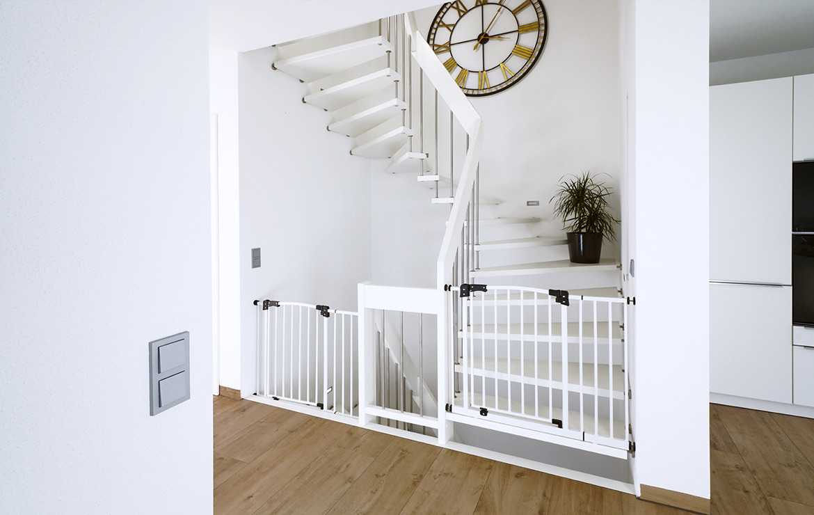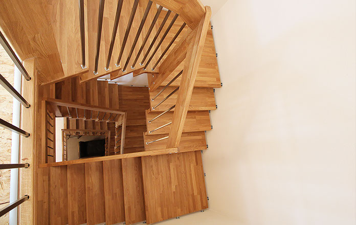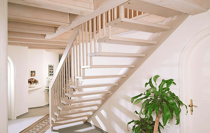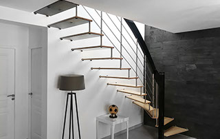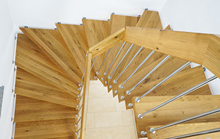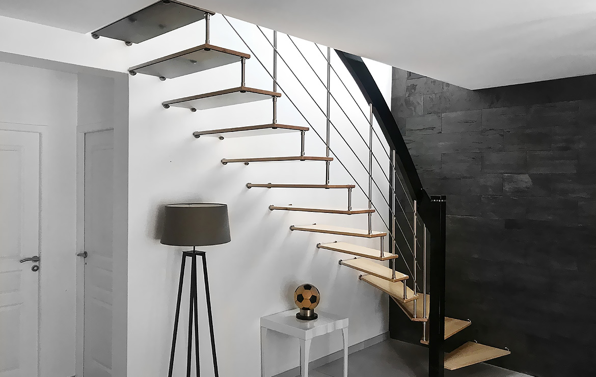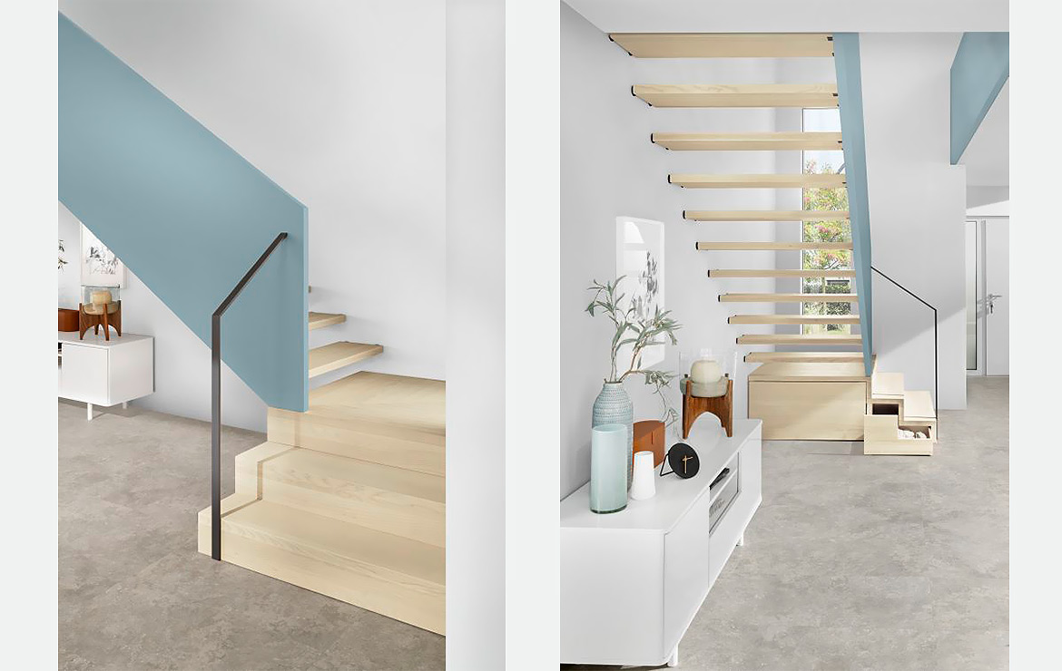 Das Geländer ist Teil der tragenden Konstruktion. Mit der Beschränkung auf das Wesentliche, nämlich Stufen und Geländer, wurde der Treppenbau revolutioniert. Quasi unsichtbar halten die in schalldämmenden Kautschuklagern gehaltenen Stahlbolzen auf der Wandseite die Treppe und das Geländer (Handlauf und Sprossen) die einzelnen Treppenstufen auf der offenen Seite. Eine optimale Verbindung aus Technik und Design, mit vielen Vorteilen.